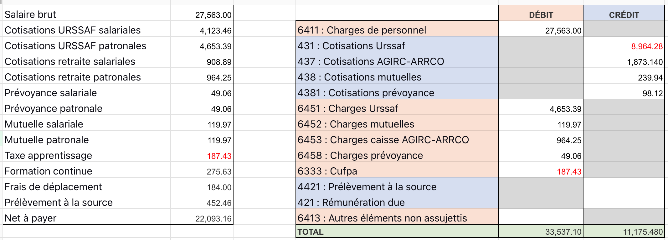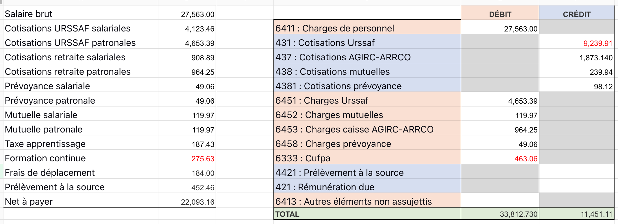 Crédit 421 - Rémunération due : 22 093,16 €⚠️ Vérification : Total débits = Total crédits = 33 996,73 €