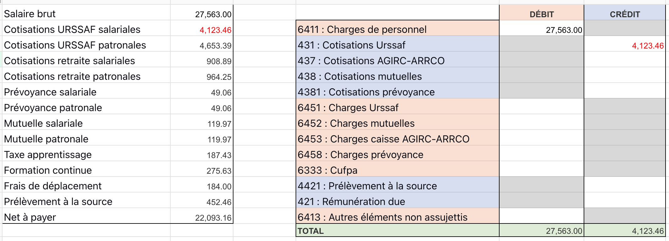 Débit 6411 - Charges de personnel : 27 563,00 €2. Cotisations URSSAF salariales : 4 123,46 €